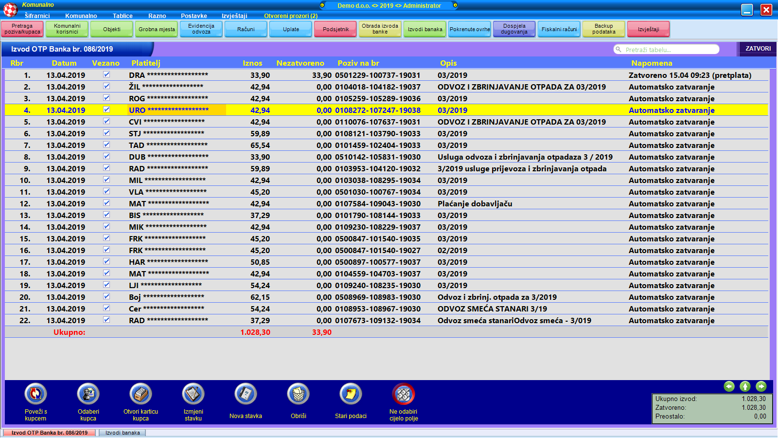 Program je izrađen s ciljem da omogući brz i pregledan rad korisnicima. Obračuni se vrše jednim klikom, uz automatizirano razvrstavanje računa/obračuna za ispis, slanje e-mailom ili kroz sustav eRačuna. Korištenjem 2D koda, program kroz automatsku obradu izvoda banke zatvara većinu uplata tako da je rad korisnika u tom segmentu izuzetno olakšan. Pored evidencije i obračuna odvoza, program se može koristiti za vođenje i evidenciju grobnih naknada te evidenciju i naplatu raznih usluga nevezanih uz otpad. Iz programa se mogu slati opomene, IOS-i te prijedlozi za ovrhe. Osim automatskih obračuna putem sustava čipiranih spremnika, obračuni se za pojedine kategorije ili korisnike mogu vršiti i ručno naredbom.