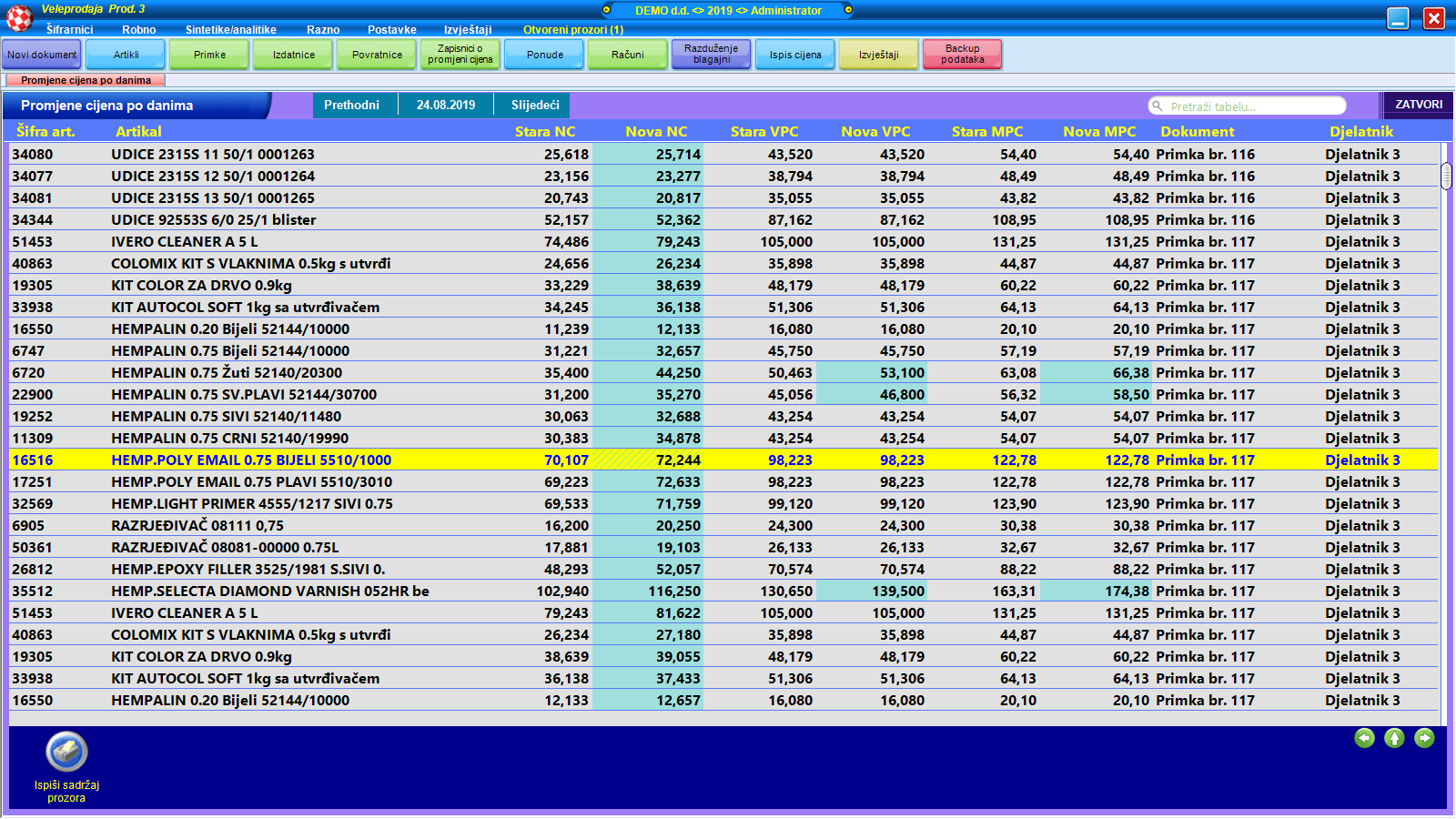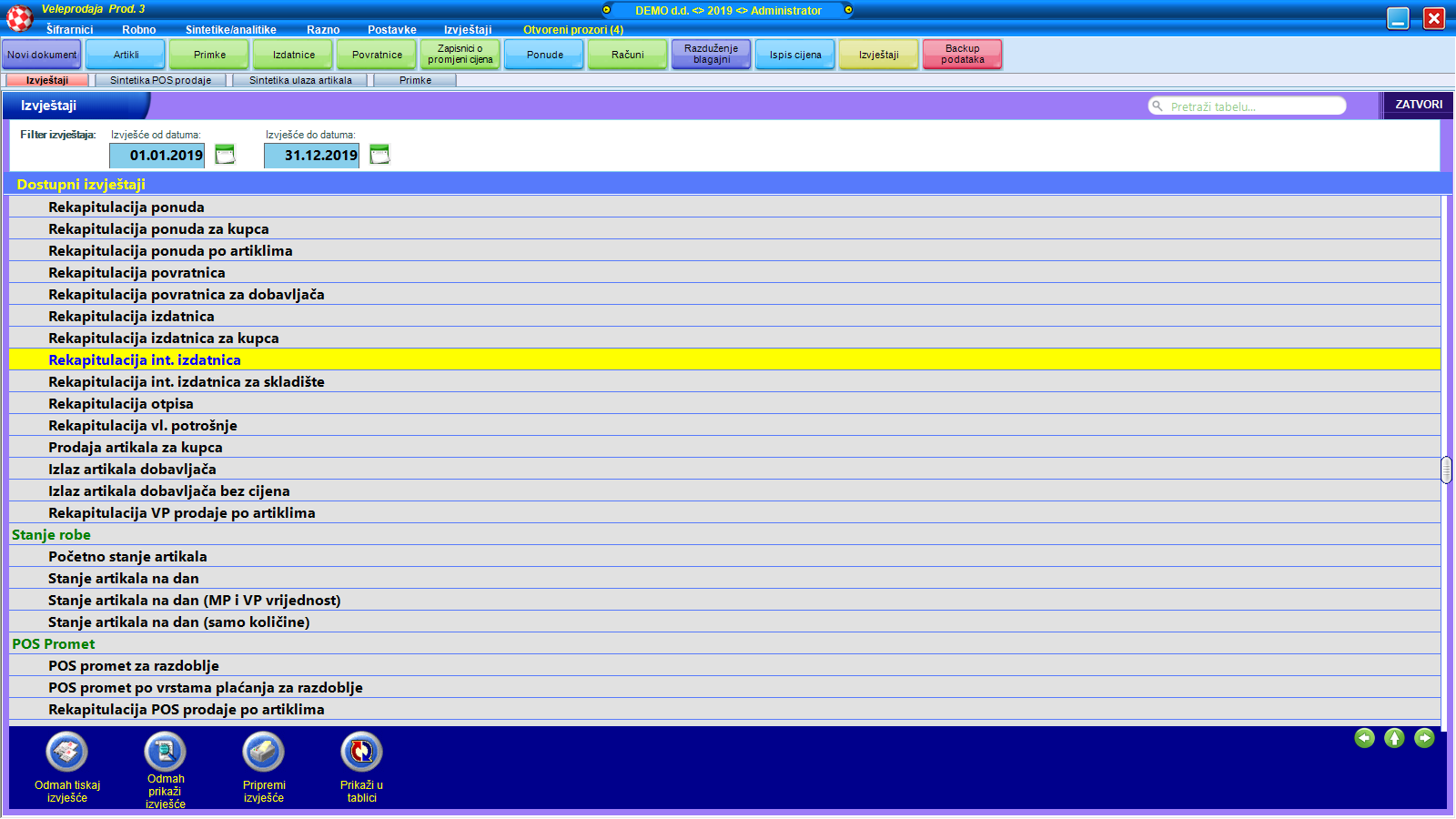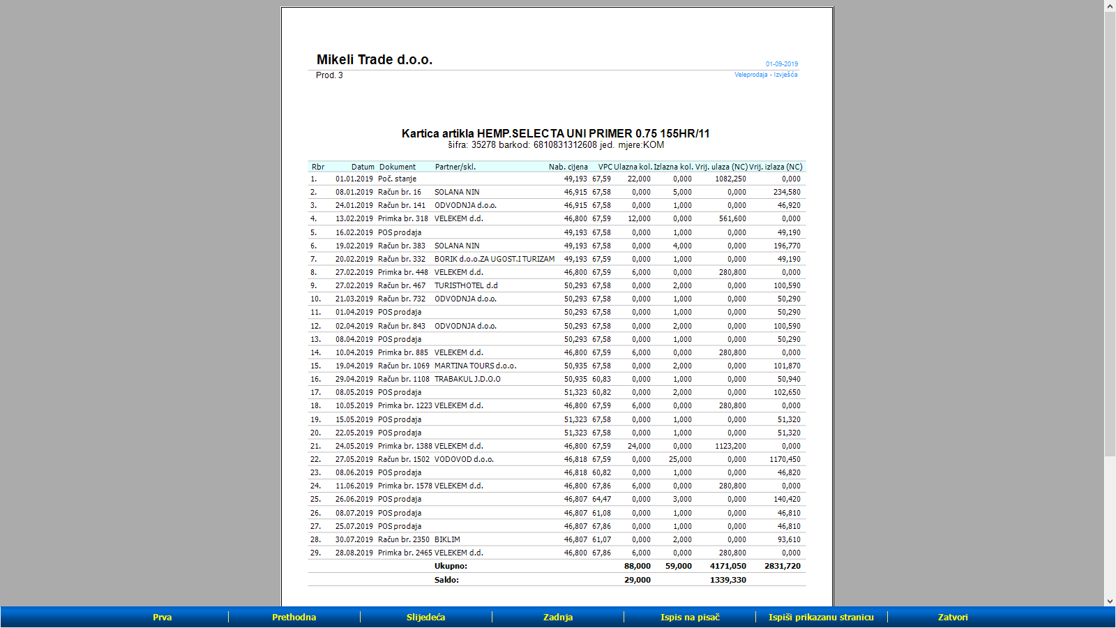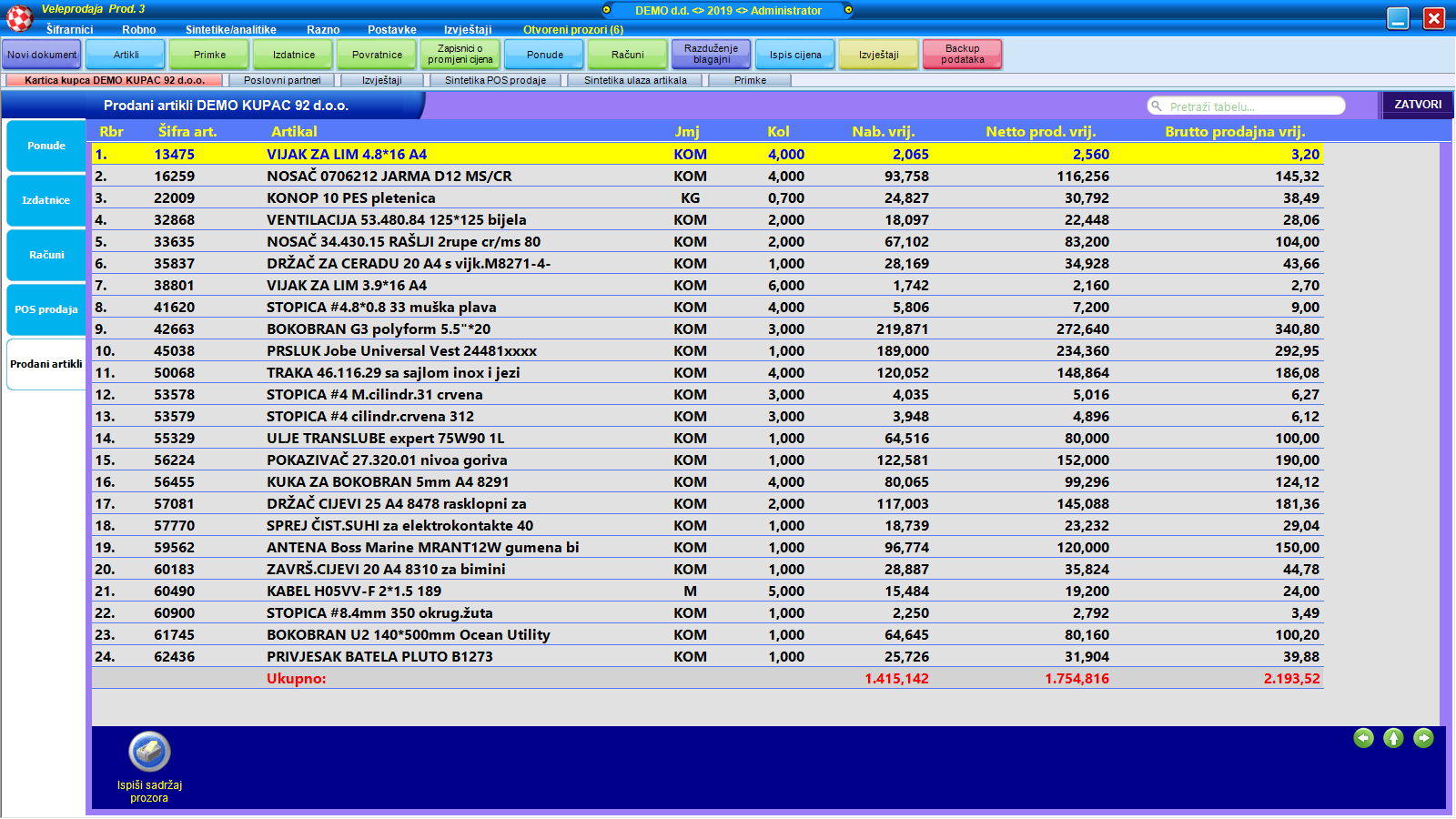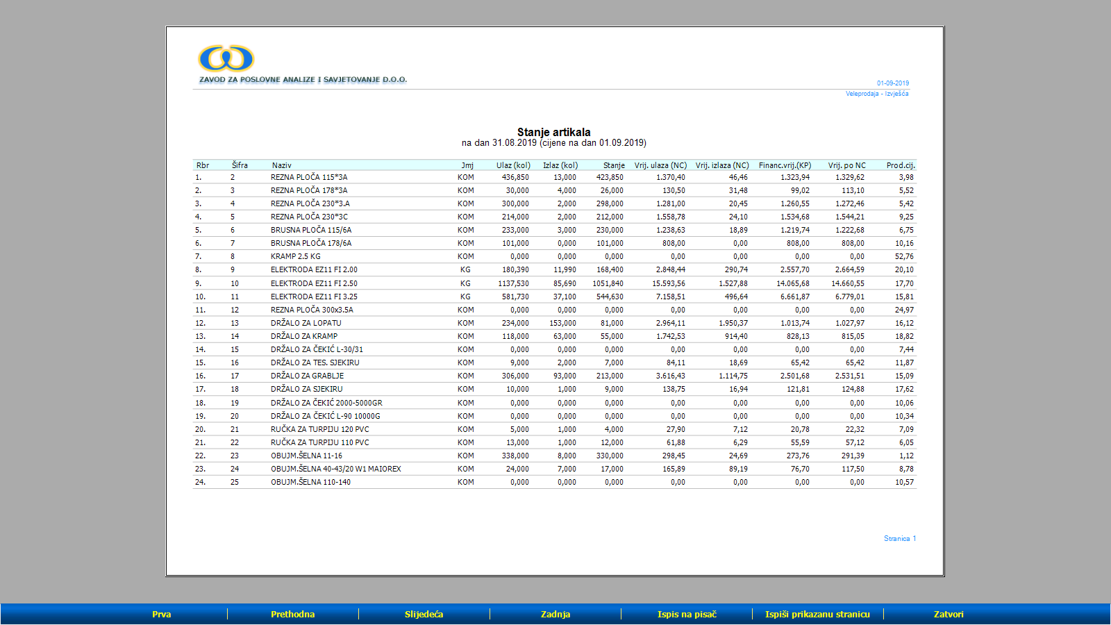 Program je jednostavan i pregledan za rad te maksimalno automatiziran. Sadrži sve potrebne elemente za rad poput primki, izdatnica, povratnica, prijema robe, ponuda, računa, otpisa i vlastite potrošnje, inventura (djelomičnih i potpunih), terećenja i odobrenja, internih primki te izdatnica, međuskladišnica, konsignacijske prodaje, proizvodnje s normativima i dr. Sve promjene cijena se mogu pratiti na dnevnoj bazi s jasnim prikazom porijekla promjene cijena. Svi podaci se prikazuju tabelarno, a unutar tabele se mogu vršiti višestruka sortiranja i filtriranja uz direktan izvoz podataka u Excel ili sl. program. Sadržaj svakog prozora se može ispisati uz jednostavno isključene nepotrebnih podataka.